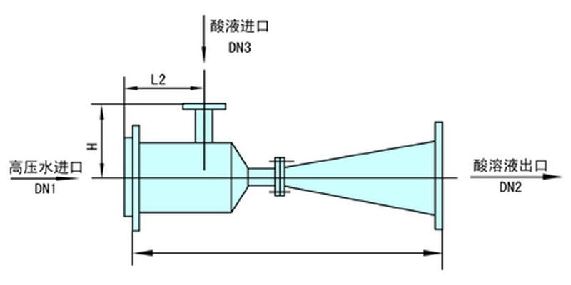 高壓原水通過(guò)管道閥門進(jìn)入噴射器的漸縮段,將靜壓頭轉(zhuǎn)換成動(dòng)能,在噴嘴處成為高速射流,使混合室形成微真空狀態(tài),將高濃度的再生藥液吸入混合室,并使再生藥液的壓力和速度發(fā)生變化;在混合段內(nèi),水和藥液得到充分地混合,然后注經(jīng)擴(kuò)散段,使再生液減低流速,靜壓頭升高,再通過(guò)出口管道及閥門將稀再生液送到交換器本體中。